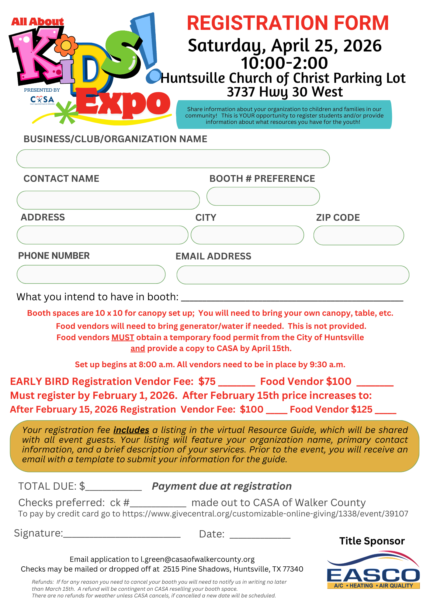 📝 Ready to secure your spot? Click here or Call 936-291-2272 or email l.green@casaofwalkercounty.org to secure your spot. For a blank layout and map, click here.