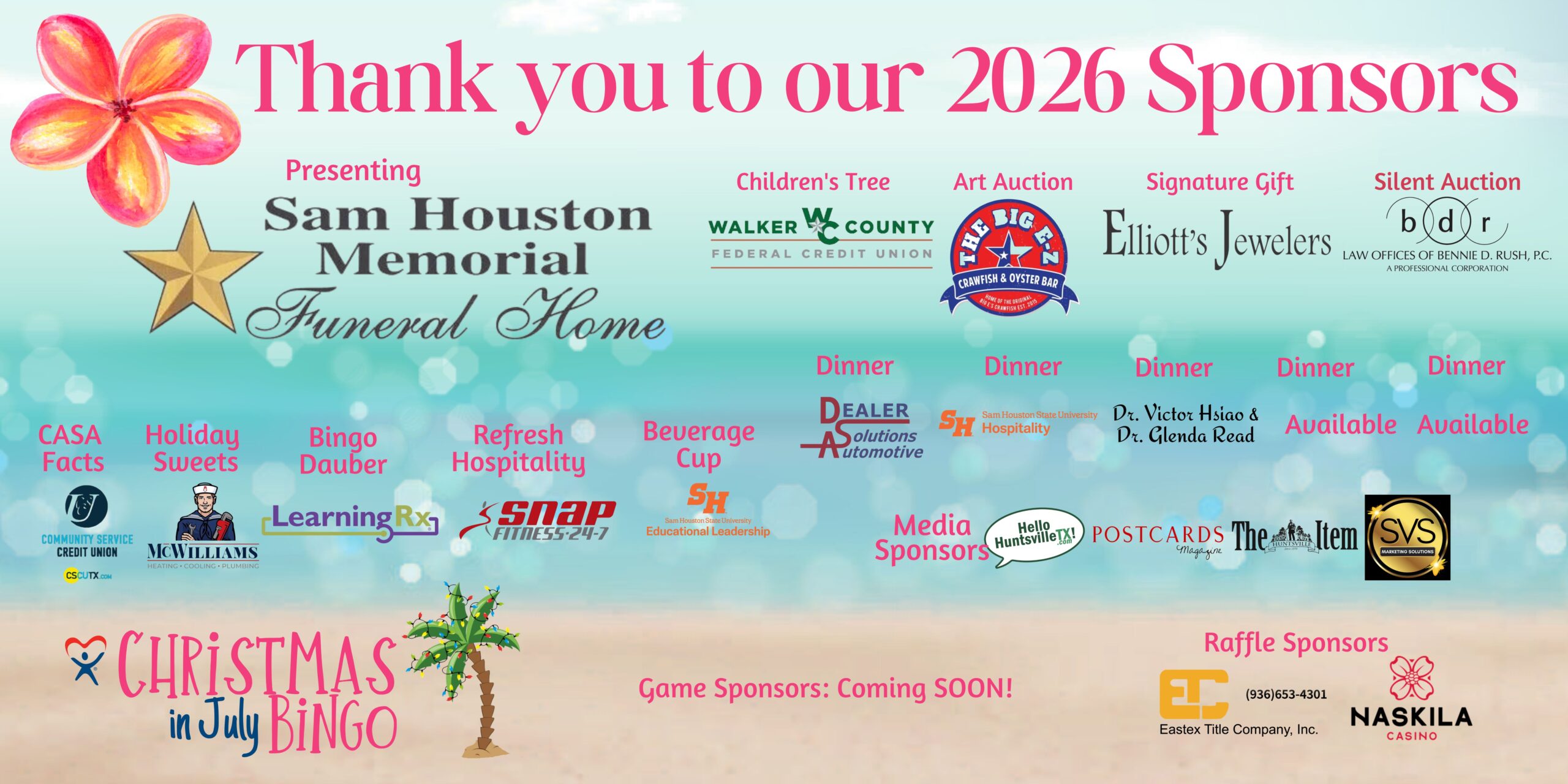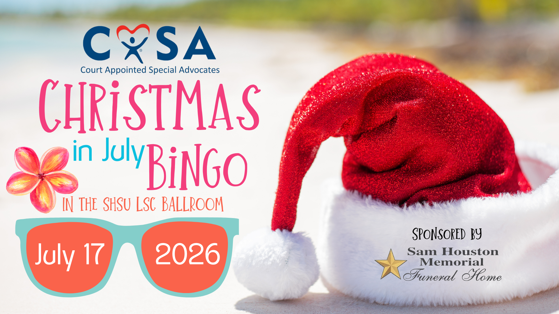 Be sure to follow our Facebook pages: Christmas In July Bingo; https://www.facebook.com/casawstbingo and CASA’s page; https://www.facebook.com/casaofwalkercounty/ to keep up with all things BINGO!